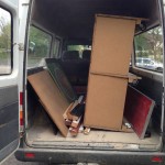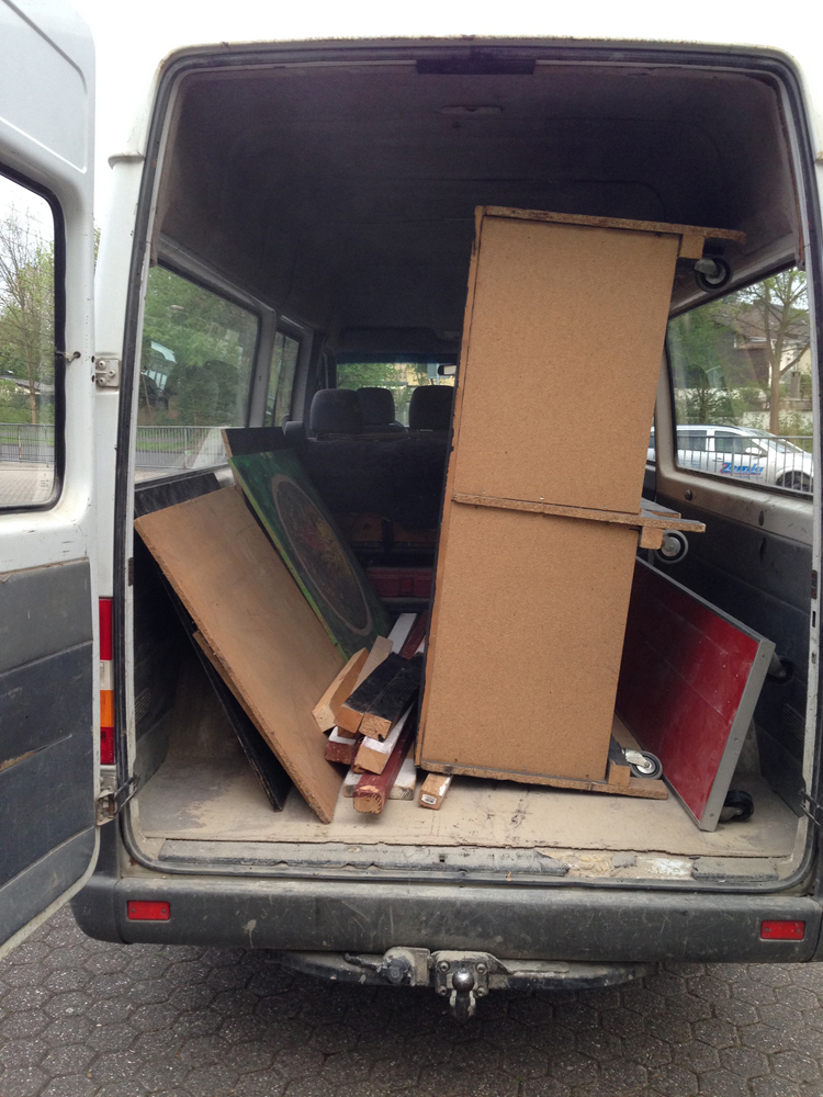 Als ersten Schritt haben Miguel und Barbara sich heute auf ins Gymnasium gemacht, um die dort vorhandene und von uns schon oft genutzte Bühnentreppe in Augenschein zu nehmen bzw. für eine drigend nötige „Aufmöblierung“ gleich mit einzupacken. Gleichzeitig werden wir das gute Stück noch einmal komplett nachbauen, so dass wir am Ende mit zwei voll beweglichen Treppen auf die Bühne können. Im Holzwerkraum entdeckten wir außerdem noch viele schöne Stücke voller Erinnerung von unseren Graffiti-Aufstellern aus „RENT“ bis hin zu Kulissenteilen der Vampire – in all den Jahren fällt halt einiges an an Bühnenbild-Teilen. Damit wir aber besser Ordnung in den Sachen halten können, haben wir mittlerweile begonnen, uns ein eigenes kleines Bühnenbild- und Requisite-Lager in einer Halle in Sindorf aufzubauen. Daher hieß es dann auch: Schleppen, Transporter voll machen und ab ins Lager damit. Ebenfalls im Gepäck: ein ganzer Kofferraum voll alter Kartons, denn auch die werden wir für die Umsetzung des Bühnenkonzeptes brauchen. In den kommenden Wochen heißt es dann für’s Team Bühnenbild: Anpacken, wo es geht, denn je schneller man mit den richtigen Bühnenelementen proben kann, desto besser laufen logischerweise die Proben 🙂