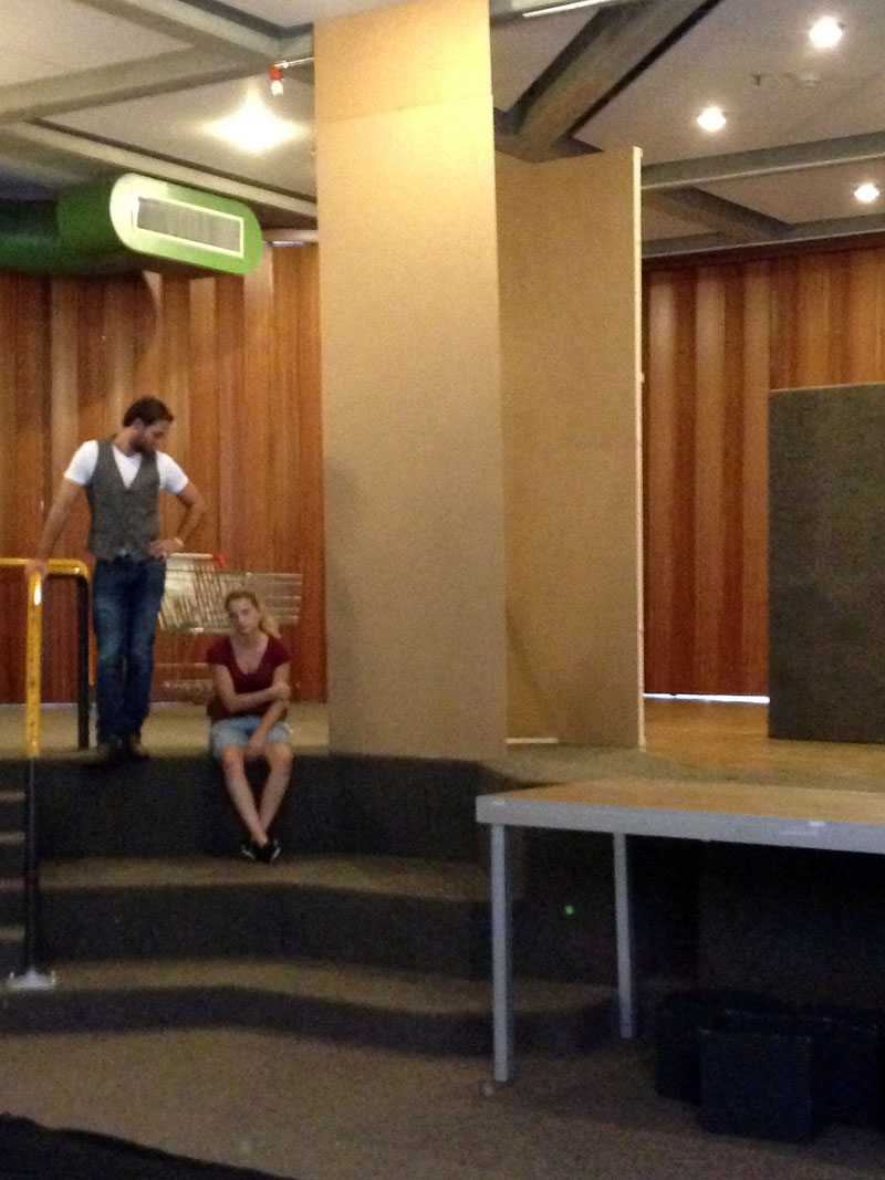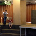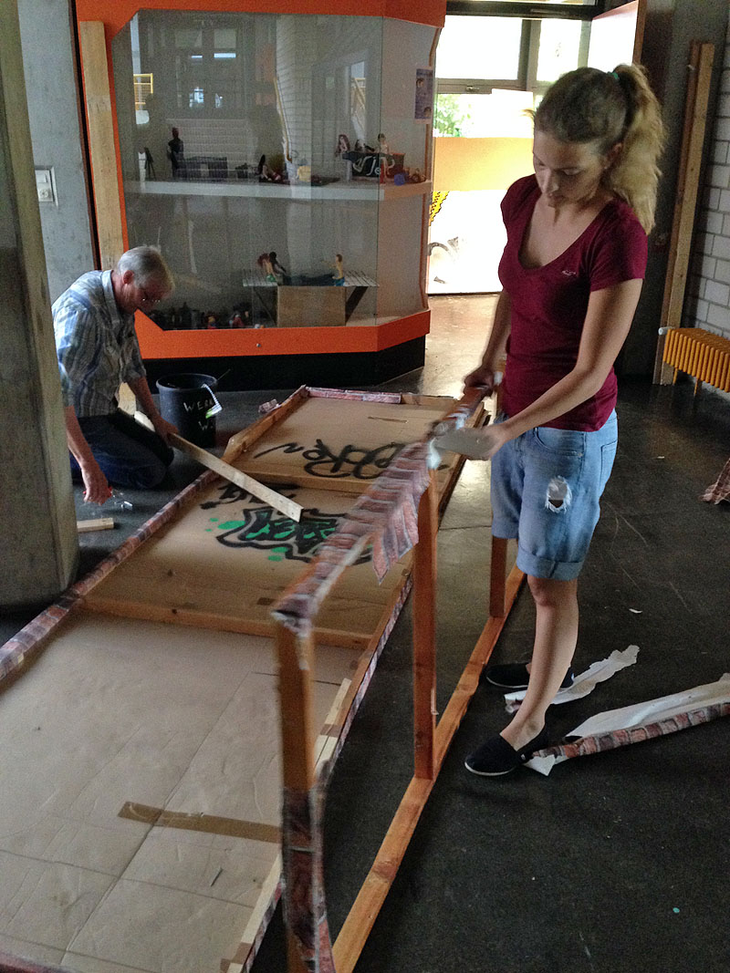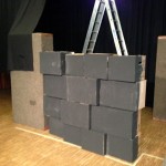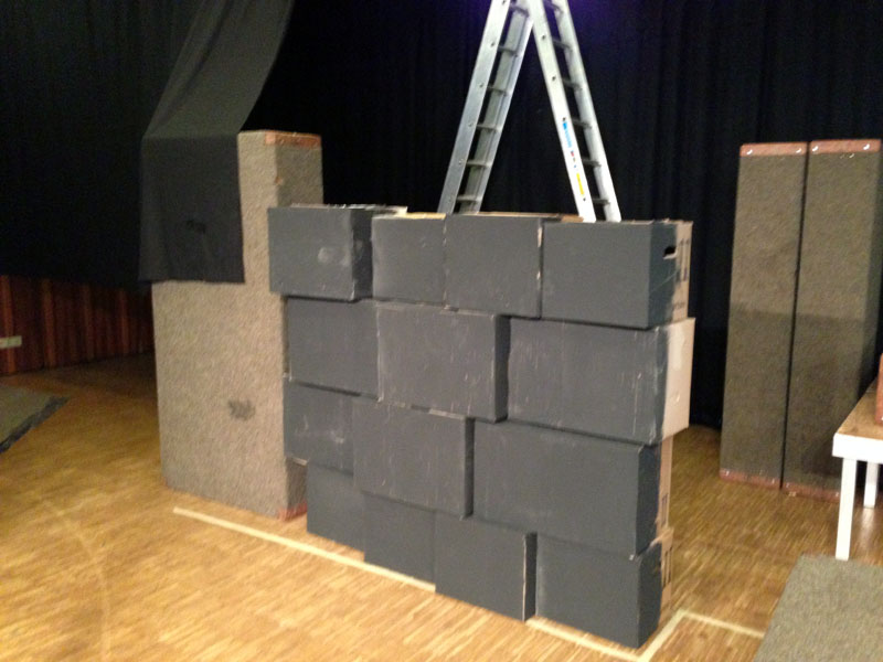 Sonntag dann endlich…ein Ruhetag! Zumindest fast – etwas Online-Shopping für Kostüme und Bühnenbild vom schweren Ledersessel bis zum Bündel Uniformhemden war doch noch drin ;). Doch mit der Entspannung war es schon Montag wieder vorbei: Ein weiteres fröhliches Quartett aus Korrep-Probe, Bühnenbild-Bastelei, Schauspielprobe und Chor-Arbeit stand an. Saschas temporeiches Solo „König der Welt“ fordert dem Pianisten alles ab, doch das Zusammenspiel klappte schon richtig gut – so kann es weitergehen 🙂 Während Sascha und Phil auf der Hinterbühne an Details feilten, war in Sachen Bühnenbild eher Grobes gefragt. Tim und Lydia hatten alle fertig gestrichenen Kartons aus unserem Lager in die Schule gebracht, so dass wir nun auf der Bühne fröhlich stapeln und vor allem abschätzen konnten, wie viele weitere dieser Dinger uns noch fehlen, um den gewünschten Effekt verschiedener Mauern zu erreichen. Gleichzeitig bekamen zwei der neu gebauten Aufsteller schonmal einen passenden Farb-Anstrich – für mehr reichte die Zeit nicht, denn es ging Schlag auf Schlag weiter mit Teil 2 von „Es sprudelt kein Fluss“. Nach zwei Stunden konzentrierter Probe war der nicht ganz einfache Song „im Kasten“ – Feierabend für’s Ensemble, nur Michi erarbeitete auf Probebühne Nr. 2 im Keller noch Schauspiel-Details ihres Solos „Sterne und Mond“.
