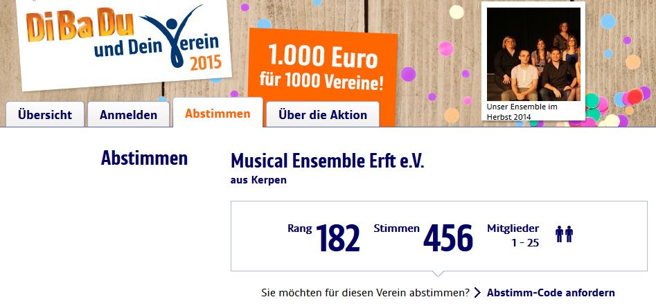 Und nicht zuletzt trommeln wir weiter fleißig um Stimmen im großen Vereinswettbewerb der ING-DiBA, wo wir in diesem Jahr unter die ersten 200 Vereine unserer Größenordnung kommen müssen, um uns eine Spende von 1.000 Euro zu sichern. Momentan ist es ein heißes Rennen – wir freuen uns über eure Unterstützung mit nur ein paar Klicks unter: https://verein.ing-diba.de/kultur/50170/musical-ensemble-erft-ev!