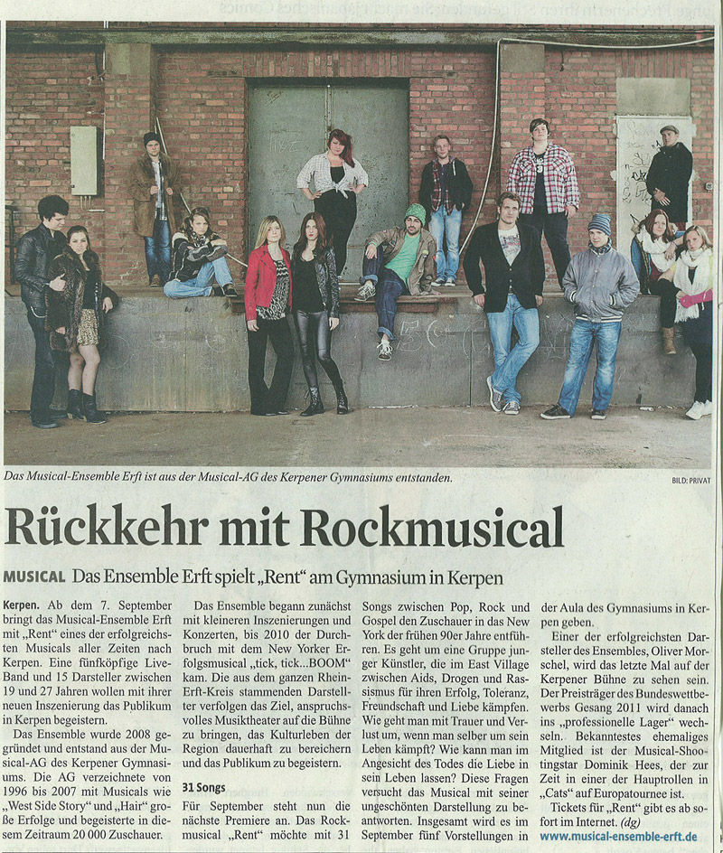 Musical „RENT“: Ensemble probt für neues Stück (Kölnische Rundschau, 17.08.2012)
