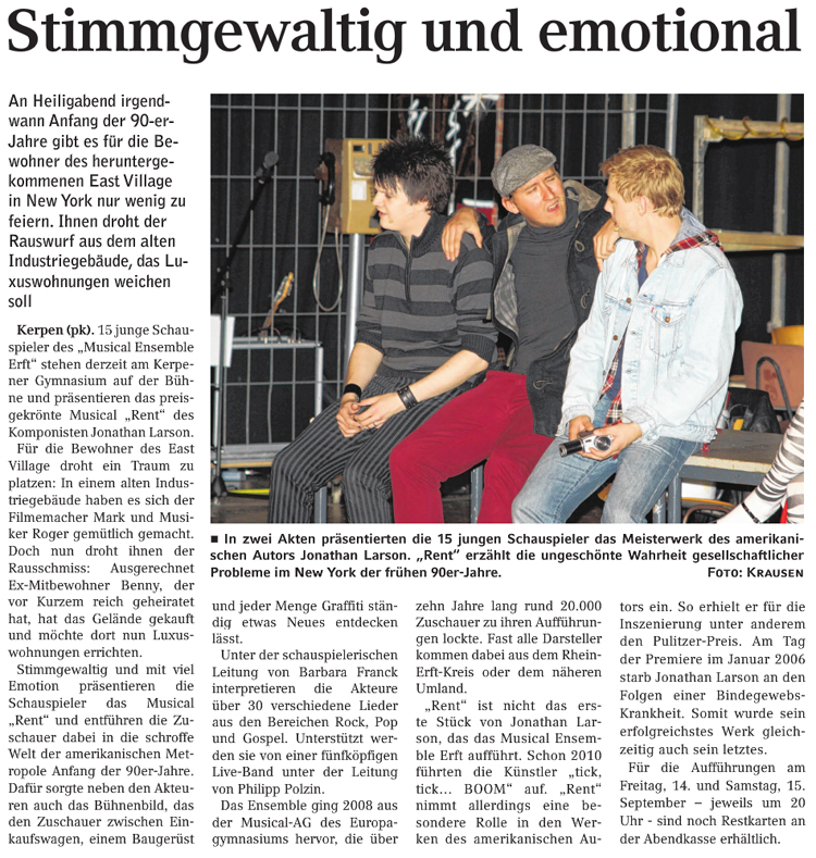 Das Musical Ensemble Erft e.V. zeigt „Rent“ für wenige Termine (Musical Total, 31.08.2012)