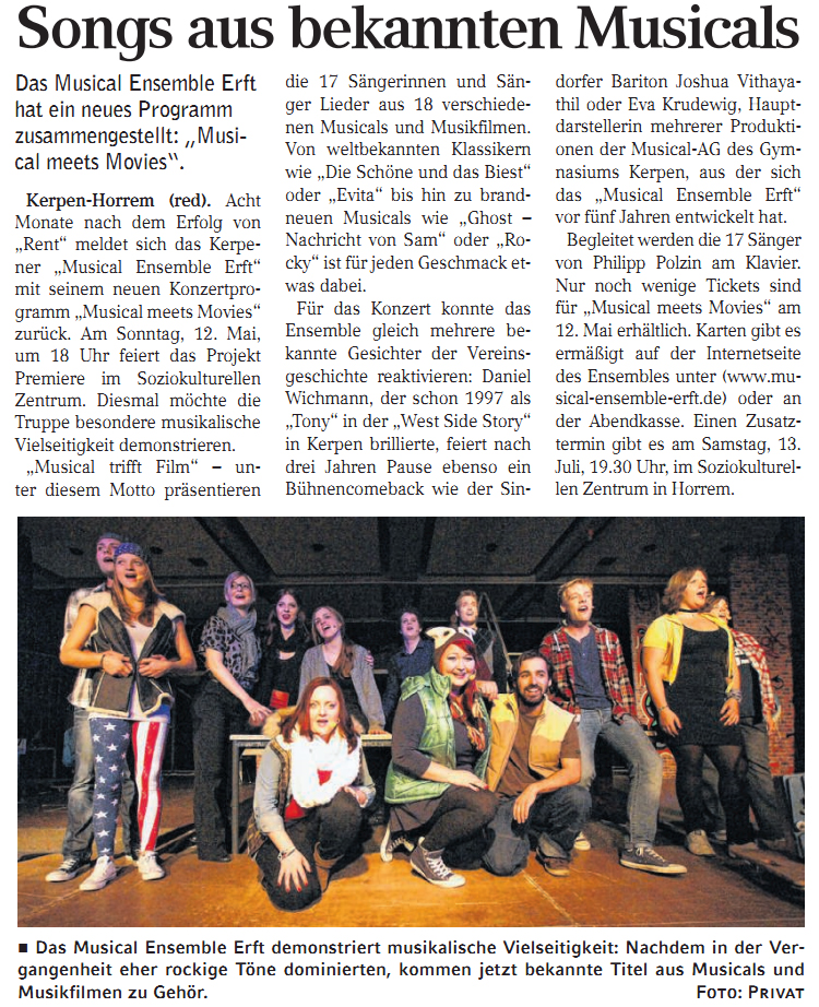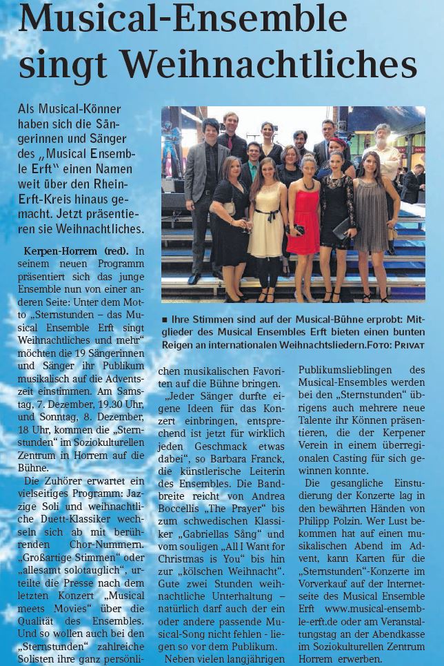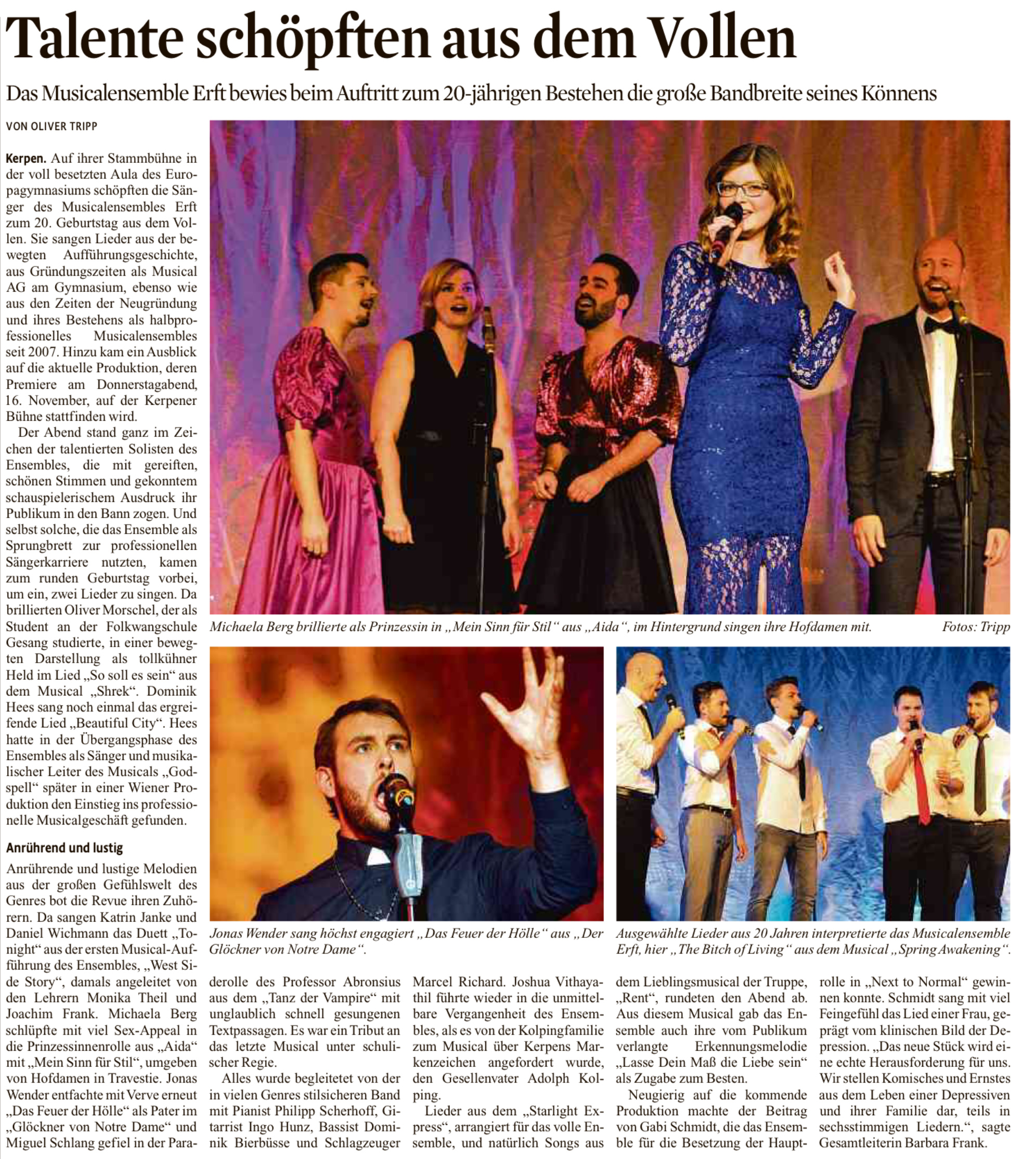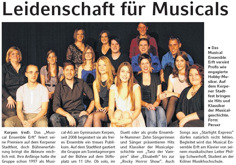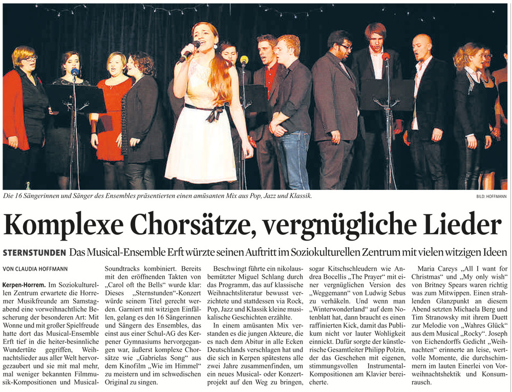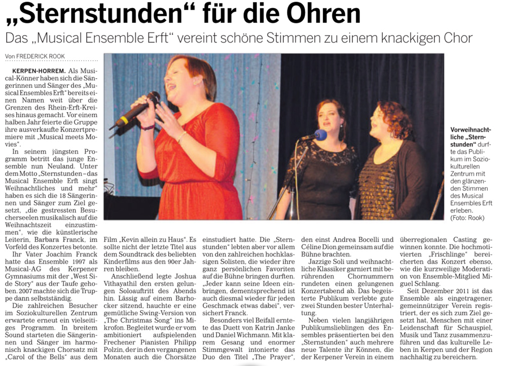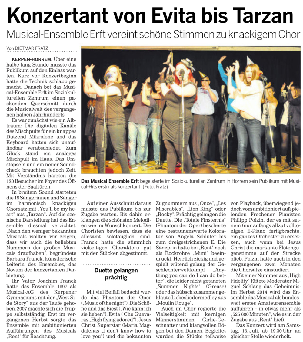„Das Musical Ensemble Erft aus Kerpen ließ im zweiten Teil des Neujahrskonzertes[…] seine Stimmen sprechen und begeisterte die Besucher. […] „Wenn ich tanzen will““ aus dem Musical Elisabeth oder „Starlight Sequence“ aus dem Musical-Dauerbrenner Starlight Express belohnten die Zuhörer mit anhaltendem Applaus.“