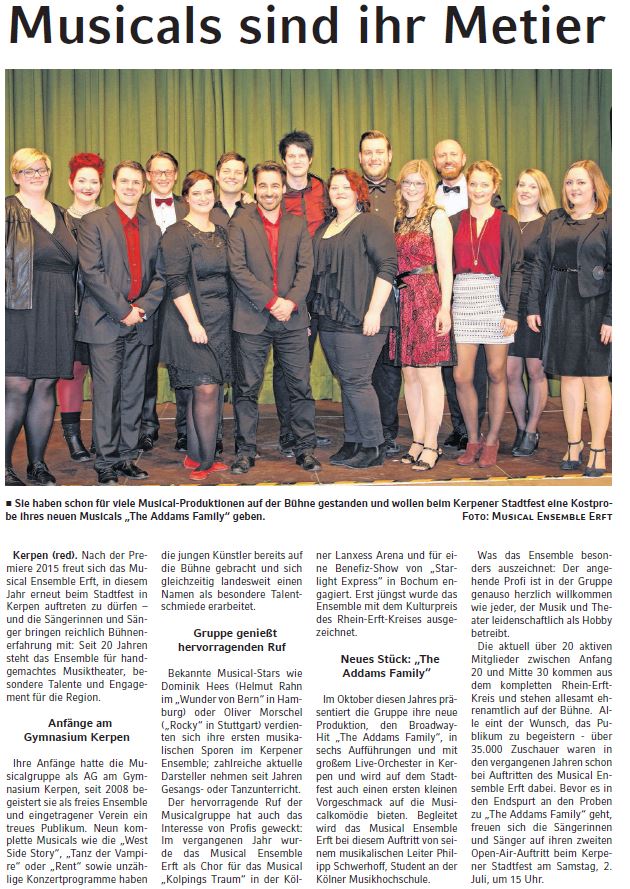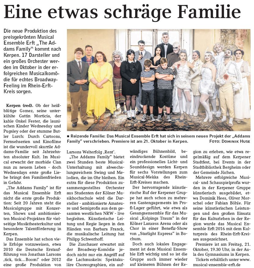 „Willkommene Werbung für die Premiere von ‚The Addams Family‘ bot die Preisverleihung dem Kerpener Kulturverein Musical Ensemble Erft. Die Darstellergruppe brachte temperamentvoll auf die Bühne, was Sprecherin Barbara Franck als die Faszination der Mischung aus Gesang, Tanz und Schauspiel beschrieben hatte.“
