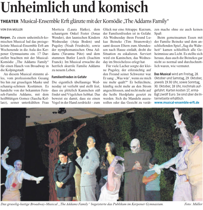 ‚Unheimlich und komisch – Musical Ensemble Erft glänzte mit der Komödie ‚The Addams Family“ (Kölner Stadt-Anzeiger & Kölnische Rundschau, 25.10.2016)