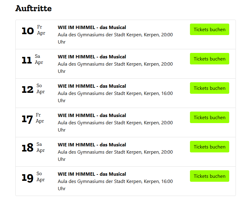 Der Online-Vorverkauf für das Musical WIE IM HIMMEL hat begonnen. Tickets könnt ihr ab sofort ganz einfach in unserem Online-Ticketshop buchen. Die Veranstaltungen vom 10. – 19. April 2026 finden statt in der Aula des Gymnasiums Kerpen. Auch in diesem Jahr werden gleich zwei wunderbare Besetzungen alternierend für Euch auf der Bühne stehen.